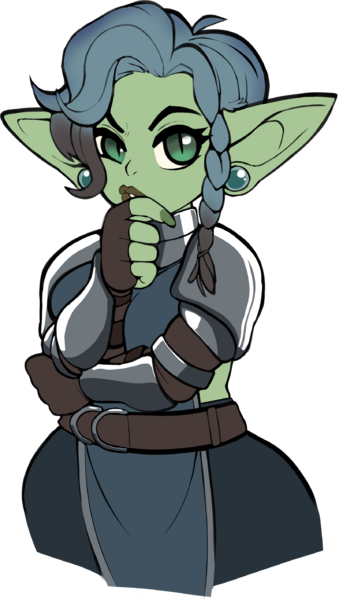 A female goblin with large ears and medium length blue hair, wearing light armor. She has her hand on her chin with an inquisitive look.