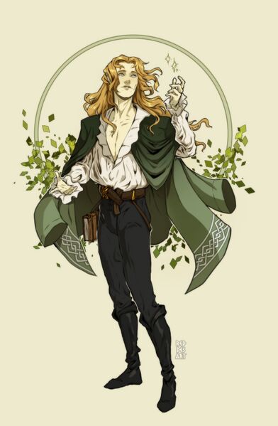A portrait of Wes Everflower, a woodland elf dressed in a green cloak with a motif of leaves. Credit to RedDesArt on Tumblr.