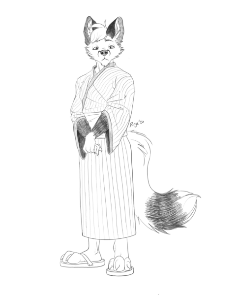 A portrait done in pencil of a kitsune in fox form wearing a kimono and sandals.
